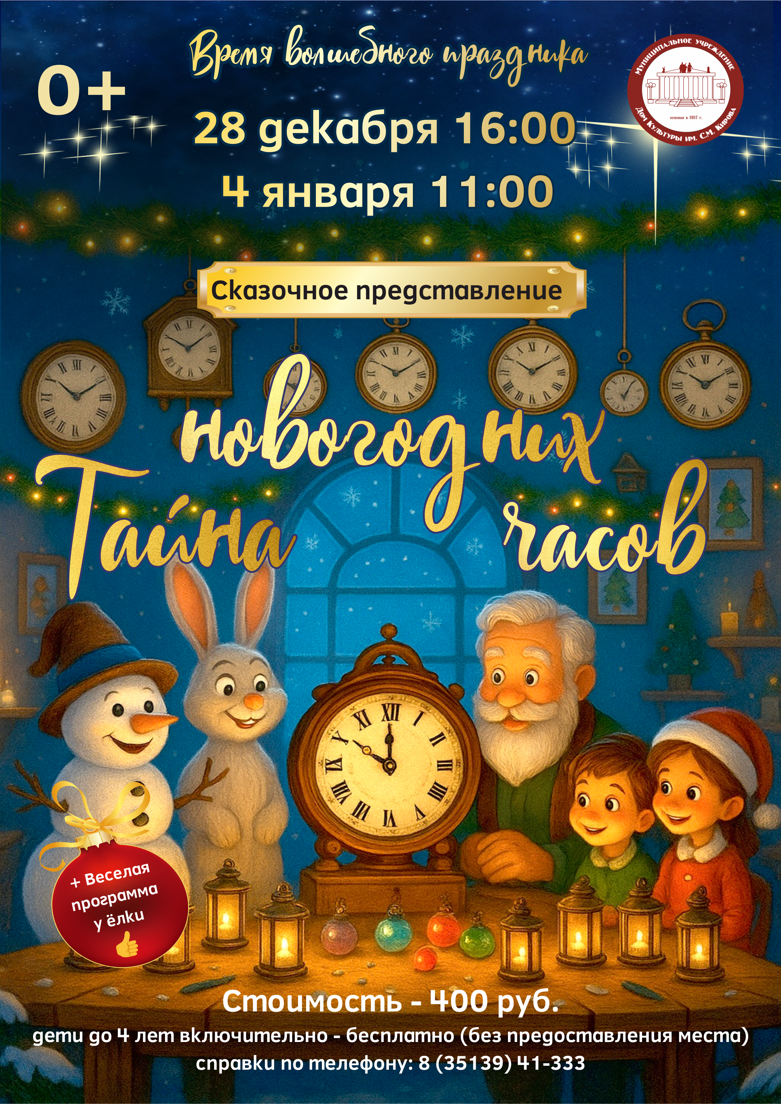 -сказочное представление «Тайна новогодних часов»: нам предстоит завести механизм и вернуть потерянное время!